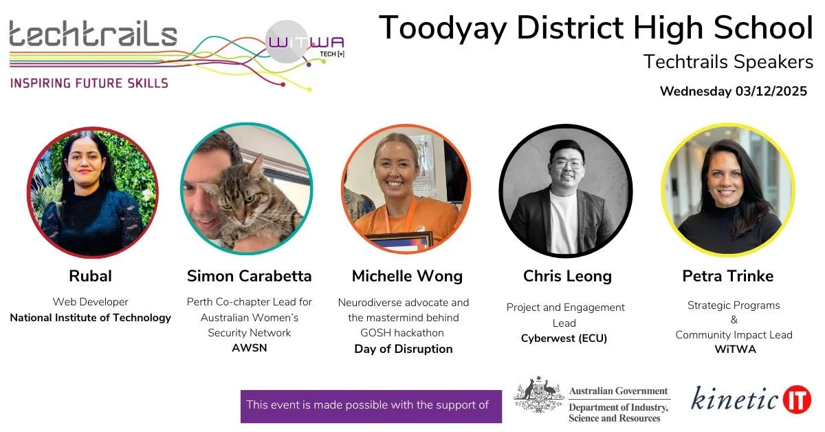 Techtrails features an inspiring lineup of speakers from WAβs tech and innovation community, covering cybersecurity, software development, Design Thinking, STEM careers, and industry pathways.