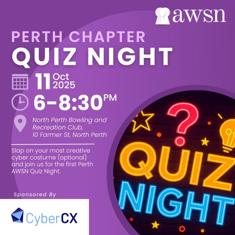 Hosted by Quiz Masters Emma O'Neil of Cyber West and Simon Carabetta from the AWSN Perth Chapter.
